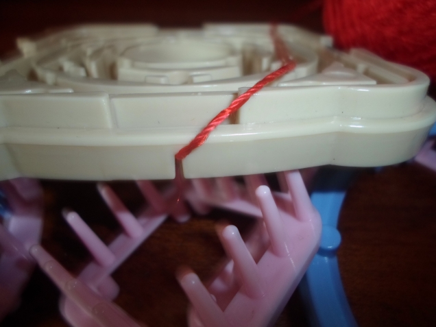 Возьмем нить, из которой будем вязать, мне нравится акрил, сделаем узелок и закрепим в прорези основы тенерифа.