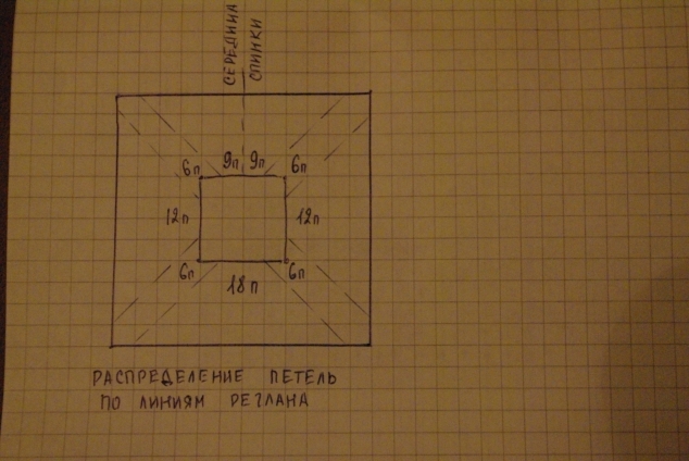Шаг 7: Отмечаем середину спинки и линии реглана нитью другого цвета, согласно схеме. В моем случае реглан сшивной по спинке из-за особенностей рисунка. Не хотелось нарушать эстетический вид изделия. Если вяжется простой реглан, или косы лицевыми петлями, можно вязать по кругу.