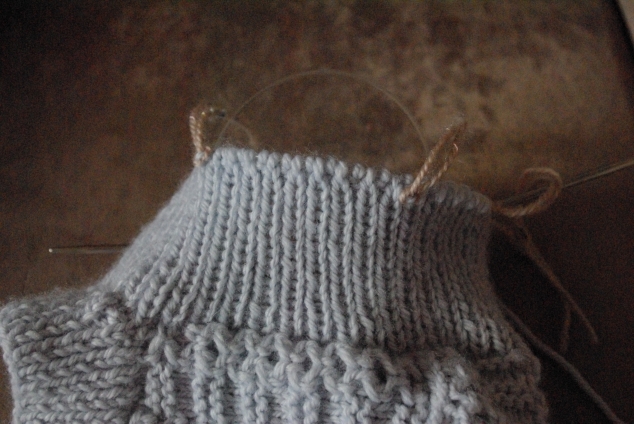 Шаг 6: Для плотного прилегания изделия к шее вяжем резинку 1*1, в данном случае вязание по кругу от 6 до 10 см