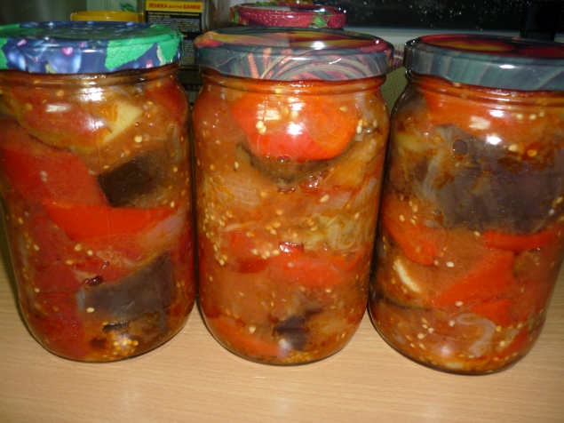 Рецепт: 10 шт. баклажан (на 4-8 частей) 10 шт. сладкого перца (на 4 части) 10 шт. луковиц (на 2 части) 10 шт. помидор средних (на 2 части) 10 шт. зубчиков чеснока целиком 250 гр. растит. масла разогреть, положить лук, через 10 минут положить баклажаны, и еще через 10 минут положить все остальное и еще добавить: 2 ст. ложки сахара; 1,5 ст. ложки соли; 1,5 чайной ложки уксусной эсенции. Я еще добавила 1 чайную ложку красного молотого перца, но это на любителя. В общей сложности готовить 1:10 -1:30 смотрите по ингридиентам, чтобы не очень разбрюзли. Разложить по банкам, перевернуть и укутать до полного остывания. Выход 6 банок по 0,650 гр. Приятного аппетита!!!
