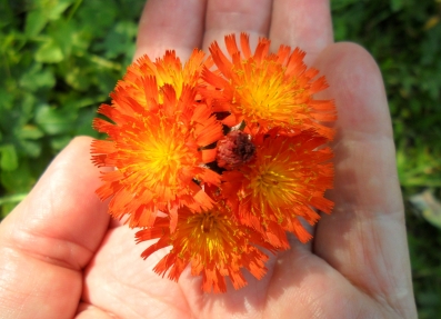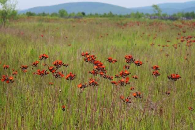 Любаша.если ты имела в виду эти цветы, то они называются ястребинка оранжево-красная.Бутоны у этих цветов темнее, чем раскрывшиеся, вот и кажутся издалека чёрными.У нас они растут в горах.