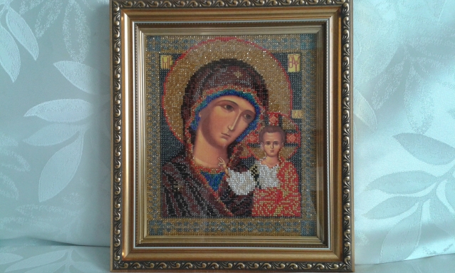 Давно не выкладывала своих работ. После долгого перерыва представляю вашему вниманию две иконы Казанской Божьей матери, выполненных в различных техниках - бисер и алмазная мозаика. Бисерная икона 20х25, икона из алмазной мозаики 32х40. Алмазную мозаику пока ещё не оформила в багет. Сильно не ругайте за качество фотографий, снимала на телефон. Кое-где блики от света остались.