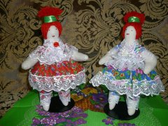 Текстильные куклы Тильды Толстушки. Изготовленные изо льна, наполнитель халофайбер. Наряды сшиты из бязи и кружев. Волосы из пряжи для вязания. Лицо вышито биссером. Рост 30см. Подставка изготовленна из пластика к которому приклеина проволока. Проволока вставляется по юбочку сзади, не повреждая куклу. При желании куклу можно снять с подставки.