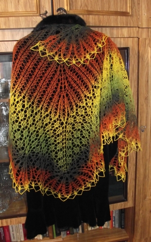 Шаль из 100 % шерсти, длина = 90 см, размах = 180 см., по низу = 340 см.