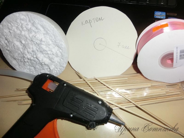 3.вырезать из картона круг на 1-1.5 см больше чем наша пенопластовая основа.