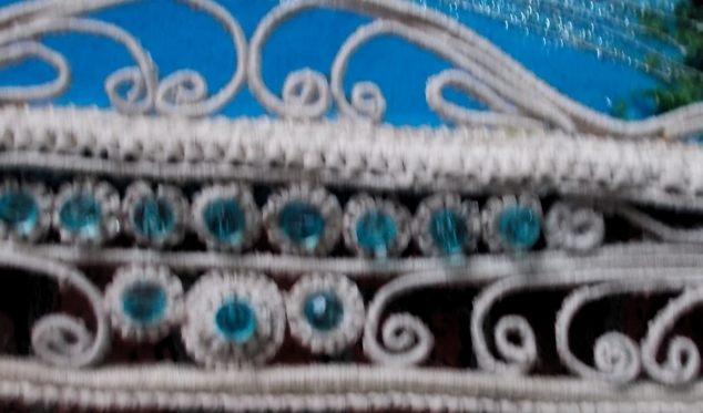 Одежду выполнила в технике ниточной аппликации. Украшения-макраме.Траву- гильошированием и ниточной крошкой. Нимб: сначала вырезала лучи из полупрозрачной белой ткани, приклеила, затем из прозрачной ткани -органза, приклеила нитки с серебристой нитью и нанесла блестящий серебристый клей .