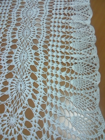 Результатом довольна не особенно. Такую салфетку ( метр на 40 см) вязала вообще впервые. Ошиблась нитками. В магазине предлагали и вариант потолще, но я отказалась и вязала этими. Нитки ализе мис. 100% мерсеризованный хлопок. Ушло 3 мотка по 50 грамм на 200 метров. Схема с рисунком ананасы из интернета с небольшими отклонениями. Хозяйка хотела дыры поменьше, пришлось немного менять схему, но не очень получилось - по бокам пошли волны.