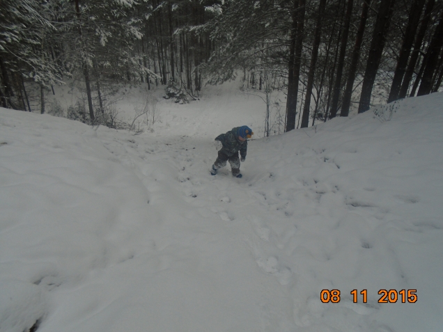 Вот это и будет сегодняшнее направление: след от снегохода, от маленького такого, с резиновым траком между полозьями, от него и полосочки: