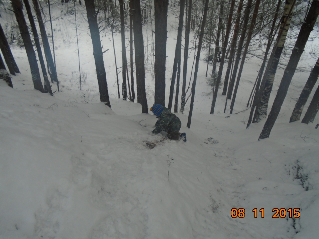 У следующего спуска снова побывали снеговикотворцы, оставили такие комочки, что никакой рычаг не помог: