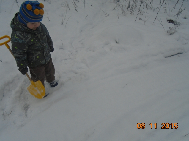 Пробежались с горки и снова наткнулись на знакомые следы снегохода. Бабушка пошла считать шаги, а внук зарылся в песок: