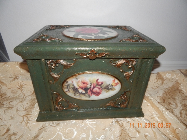 Выискала очень потрепанный жизнью сундук.Отмыла,подреставрировала,заново пошпаклевала,покрасила,на медальонах сделала декупаж лаковыми распечатками . Люблю все золотое,поэтому вышел очень яркий и блестящий.Пристроила к оливковому комплекту . Пока не нашла подходящие ручки к нему,а может уже и лишние будут.