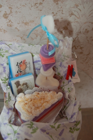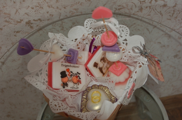Приятельница попросила сделать "мыльный" подарок, она шла на свадьбу к приятелям. Хотелось сделать что-то оригинальное, а не просто упаковать кусочек мыла. Вот что получилось.