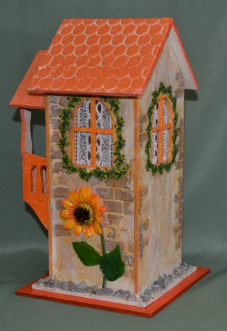 Стены - имитация штукатурки + работа с трафаретом (кирпичики) - шпаклевка. Крыша на домике - трафаре+ шпаклевка. Крыша на балконе - 1 - шаговый кракле. Покрыт матовым лаком. Глянец - на крыше и на распечатке вьюнка. Подсолнушки - мини - купила в магазине, а камешки привезла летом с моря. Шторы в домике - старое кружево цвет светлого топленого молока. Домик мне и заказчице понравился - получился такой солнечный, теплый. А поверхность домика хотя и немного шершавая, но его (чайный домик) очень приятно держать в руках - он такой уютный. Открыла для себя оранжевый цвет.