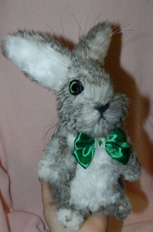 Сегодня у меня получился вот такой пушистый кролик. Высота вместе с ушками 25 см. Уши армированы и гнутся. Искусственный мех, фурнитура, атласная лента, леска, синтепух.