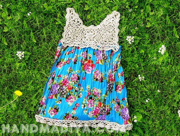 В сэконде накупила разных юбок из нежного батиста,ситца,но носить не стала.В интернете увидела переделку http://www.handmadiya.com/2014/06/blog-post.html#more и соорудила дочке вот такой сарафанчик.