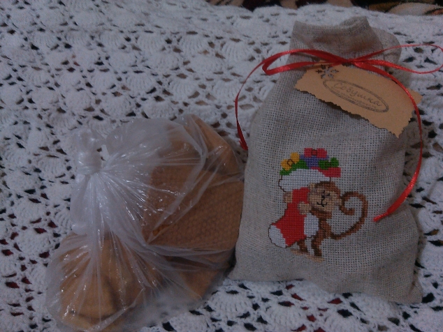 На дне нашей посылочки от Снегурочки нашей был найден еще и вышитый ее золотыми ручками мешочек с подарками () и пакетик с печенюхами. На мешочке чудная вышивка обезьянки с подарочками