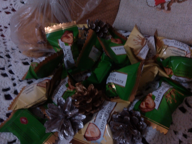 Любимые конфеты нашей семьи - «Королевский Шарм»(муж сказал, что это все ему, так как нам и так много подарков). С конфетками были и золотые, и серебряные шишечки.