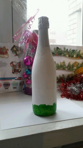Бутылку грунтуем белой краской 2 раза, затем красим акриловыми красками ствол и траву тоже 2 раза.(каждый слой наносим на высохший предыдущий)