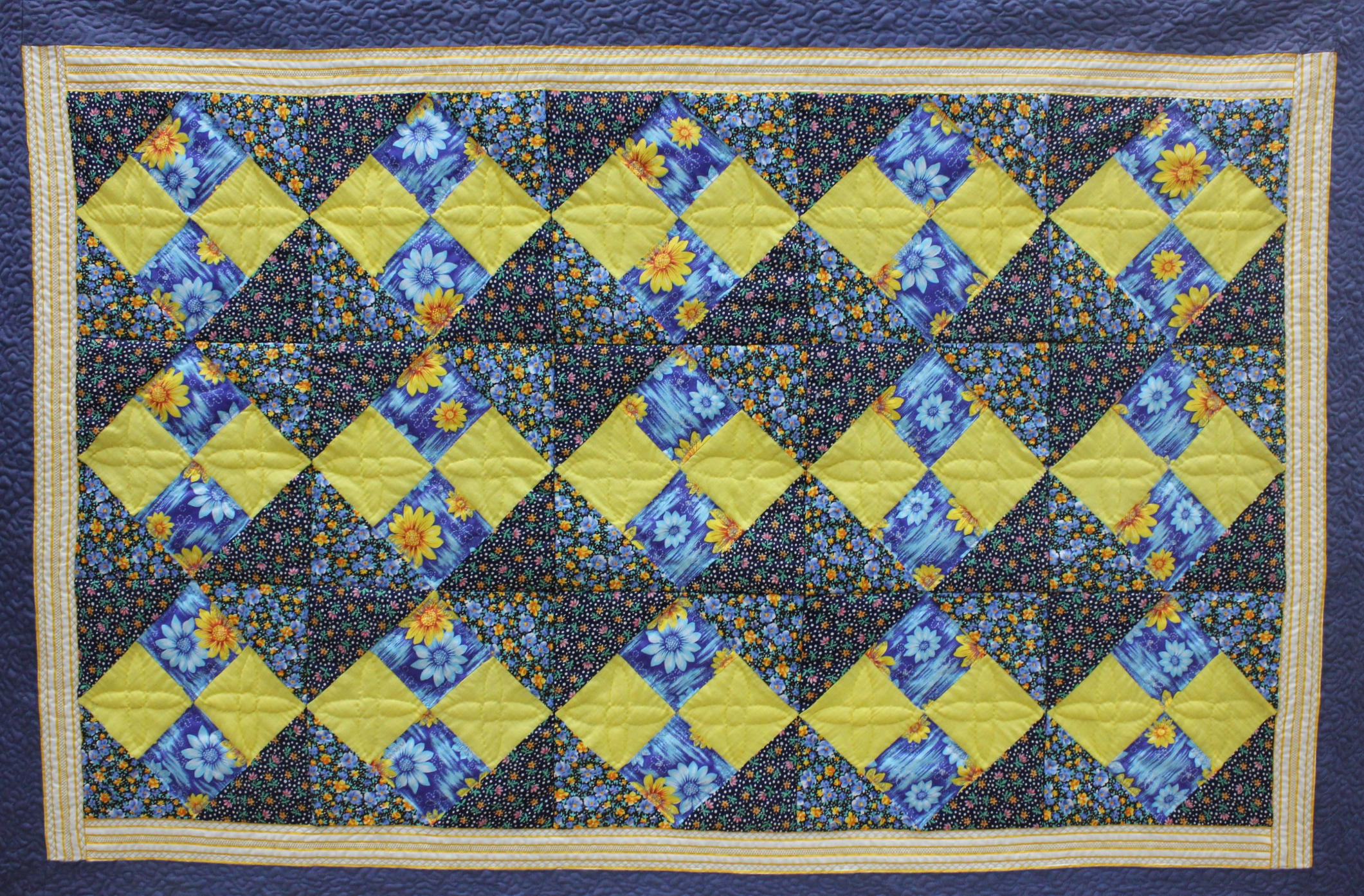 Занимаюсь лоскуткой, и шитьё из квадратов — единственное, что я люблю из всего «геометризма». Квадратики, из чего бы ни были составлены, всегда выглядят как-то по-особому уютно. А как Вы стегали само полотно, вручную или на машине? Видно, что кайма — машинная.