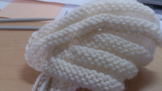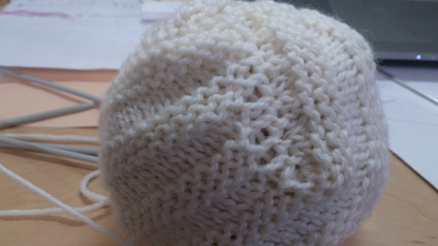 В образце у меня резинка 3х3 на картинке резинка 2х2. Вяжется донышко шапки по диагонали и состоит оно из 5-и трапеций. Начинается вязание с короткой стороны трапеции, на шапке с картинки для первого ряда набрано 14 или 16 петель (это приблизительно), далее вяжем выбранным способом в каждом нечетном ряду прибавляя с двух сторон по 1 петле начинаем это делать с первого ряда, после кромочной делаем накид, вяжем все пели ряда и перед последней кромочной делаем ещё один накид. В следующем ряду эти накиды провязываем скрещенными петлями лицевыми или изнаночными в зависимости от основного ряда. Продолжаем так вязать до нужной высоты шапки (на картинке связаны 28 рядов).
