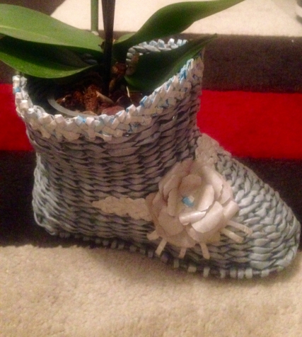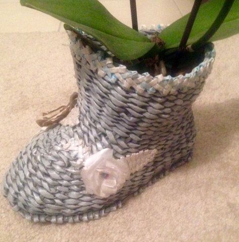 сплела два башмачка, как декор под елку или просто кашпо. Первый, белый - более праздничный получился, с декупажем и цветком из джинсовой ткани. Второй - полностью плетёный, даже подошва.