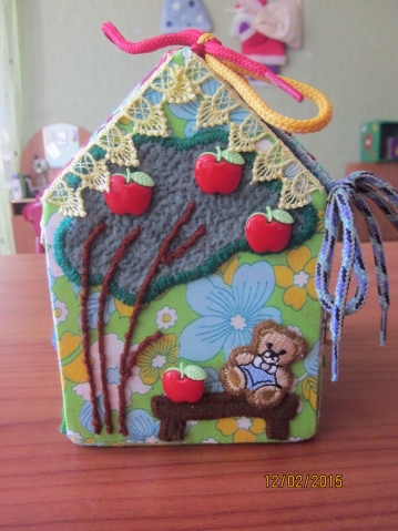 Здравствуйте! Это снова я. Хочу показать домик-раскладушечку. Выкройка из инета переделанная немного, в середину вставила твёрдый картон, обшила ситцевой тканью, а потом соединила части дома. Когда сшивала ситчик, вставила шнурки. Детали мелкие апликации обшивала по краю, а потом готовые пришивала потайным швом к готовому дому. Цветы, жучки, птички приклеила пистолетом, а некоторые пришила (вся эта мелочь продаётся в магазине. Ну а в середину дома дети поставили мебель, коврики - играли. Хотела пошить мебель из ткани, но нет выкроек, а придумывать - ушёл мой муз и когда вернётся не сказал. Вот и всё, пишите.