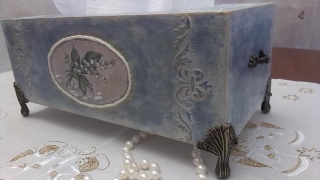 Ирина, хорошая работа.Получилась такая салфетница- мини сундучок.Кованные ножки и ручки и узор красивый в таком же стиле.А ландыши придают нежности и легкости.Мне нравится.Достойная работа для конкурса! Удачи!!!