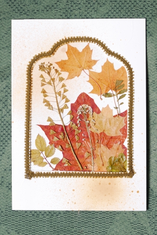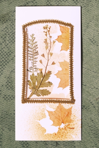 Это ещё год назад делала открытки осенней тематики. Были заготовки открыток. Из баллончика набрызк трафарет листьев. Клеила на ПВА, отделка щнур, где-то кружево, пистолетом.Получилоь интересно и не обычно.