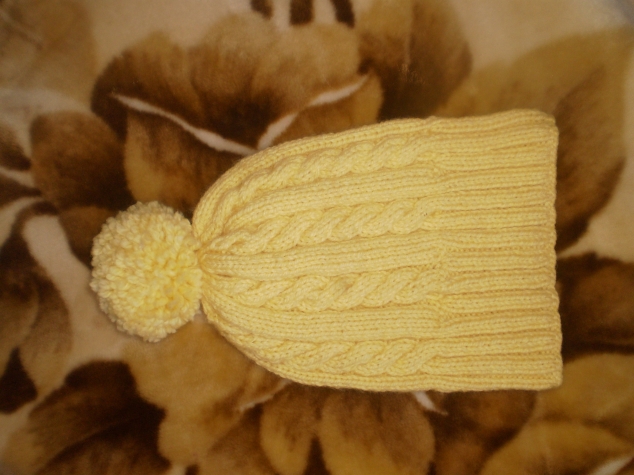 Первой работой была шапочка для дочки.Скорее по надобности-зима пришла тёплой а у нас была только толстая и жаркая шапка из плащёвки.Цены на шапочки меня конечно поразили,пошла купила спицы и нитки.Заодно познакомилась с российской "пехоркой".Вот результат