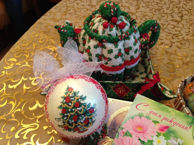 Потом прямо в день рождения получила посылочку от моей дорогой подружки Аннушки Поляковой(Розочки)! Девочки испытала не просто восторг, а культурный шок - чайничек с маленьким подносом сшитый ручками Аннушки потрясающе мягкий и такой уютний, а к нему прилагалась матрешка с чаем внутри, боооольшое колличество российский конфет (Аннушка знает что я сладкоежка) а в чайничке разные приятные мелочи для моей вышивки, а еще задекупаженный шарик (тоже занял сразу почетное место на елке)