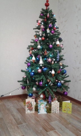 Это наша с Лёлей ёлочка,а под ней открыточки с прекрасными пожеланиями от наших друзей по форуму!!!