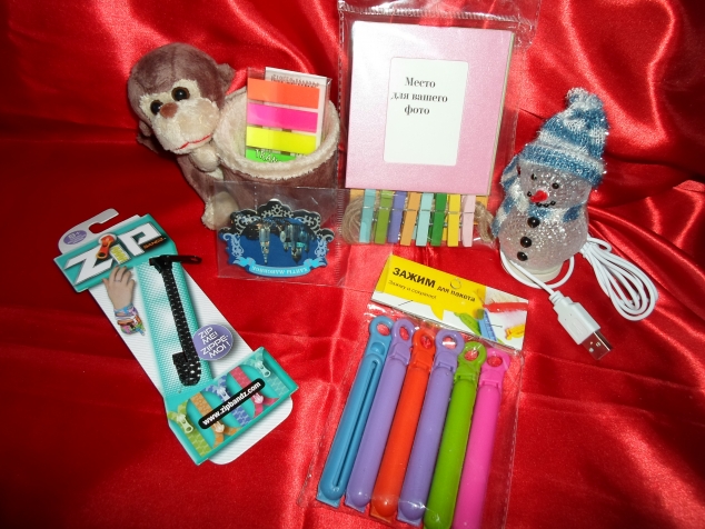 Тут море маленьких вещей, но тоже очень нужных. Снеговичок, меняющий цвет освещения, держатели для пакетов, магнит из славного города Ханты-Мансийск, обезьяна со стаканчиком для ручек, стикеры, чудесная рамка для фото с прищепками, браслет в виде "молнии".