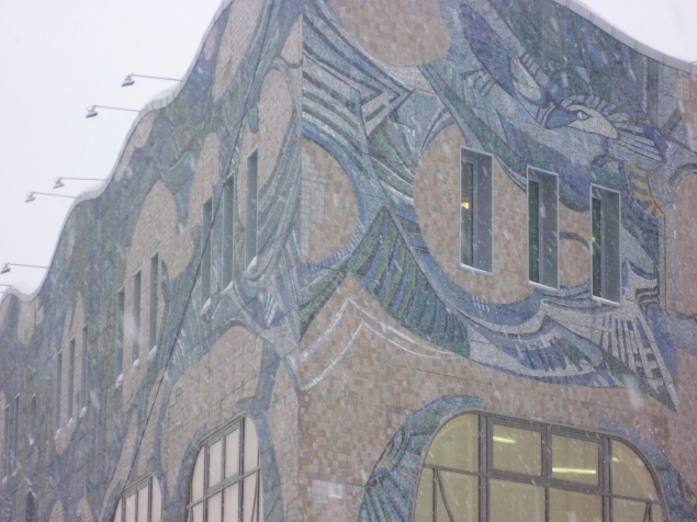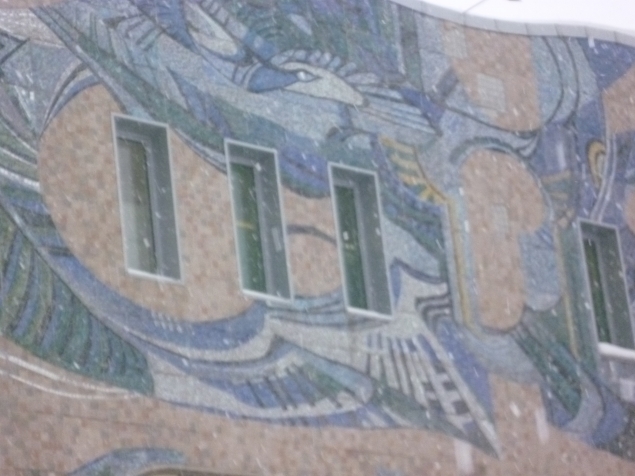 на фасаде Гостинный двор имеет мозаичную отделку смальтой