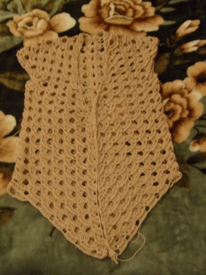 Фото сделано с изнанки.Обратите внимание на ракушки под мышкой ,две ракушки наклонились к друг другу .Я не делаю между 5-ой и 6-ой ракушками никакой цепочки.т.е.6 ст2н ,6ст2н. Ракушки вроде как плечиком теперь к друг другу прислонились. Доходим до другой подмышки и делаем тоже самое не вяжем цепочку из 3 ВП а провязав одну ракушку сразу начинаем вывязывать другую.