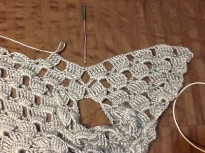 В первом ряду вместо под мышечных 3-воздушных петель я сделала 8 воздушных петельт.е. у меня цепочка длинее между 5-ой 6-ой ракушками. Я отметила на фото зубочисткой где эта цепочка у вас будет висеть после первого ряда