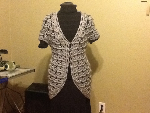Вот в сравнении с зубочисткой.Мерила когда вязала первый жилет на манекен, а когда до линии подмышки довязала тогда уже на себя мерила.Я думаю что примерять конечно надо, может все таки фигура потребует увеличить объем тогда добавить еще полный ряд ракушек