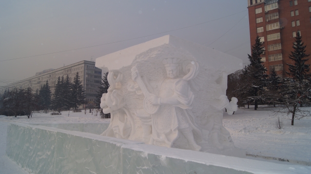 Снежные композиции выглядят "монументальнее". Для их создания снег привозили из-за города, трамбовали в специально сделанных кубических формах, а затем скульпторы пилами, стамесками, утюгами и фенами "отсекали" всё лишнее