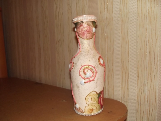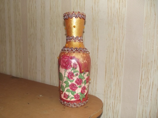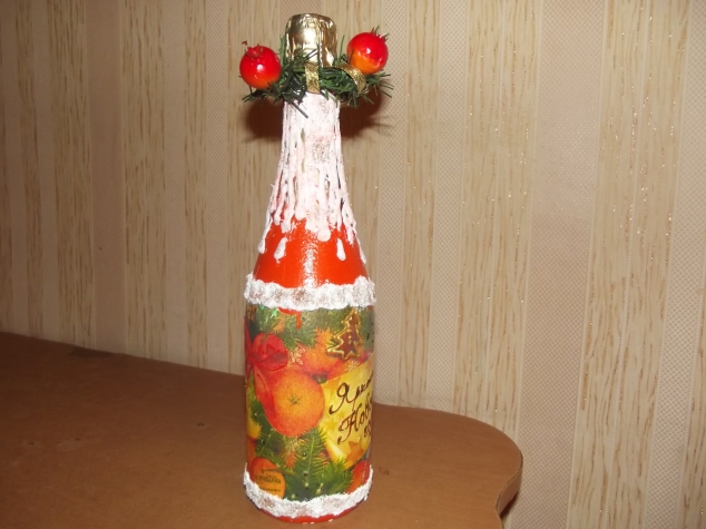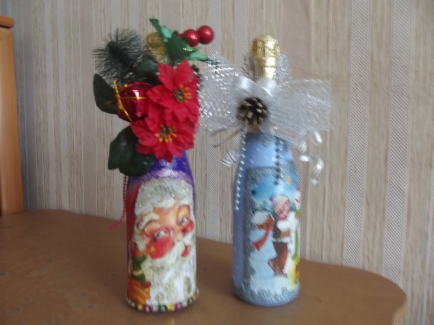 Вот такие бутылочки я делаю на Новый год, с днем свадьбы и просто оформляю баночки и бутылочки для кухни. Пробую делать ключницы, вазы, графины.