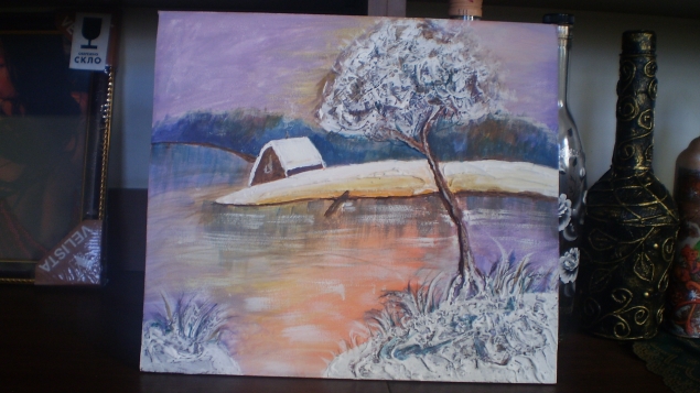 Вот решила показать вам свои первые картины ,краска акрил . Домик на острове сделан немножко барельеф ,не знаю увидите ли вы,там дерево и остров с домиком немного выпуклые,это моя пробная картина-пано,так что не совсем вышло как хотелось.