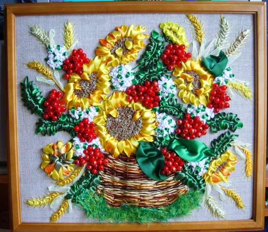 Работа сложная, большая.Очень понравились ягодки рябины.На фото не совсем поняла чем Вы их запечатали? Похоже на бисер.Подсолнух серединку тоже не разобрала, как вышивали.Может французский узелок лентой? Хочется ведь в такой работе всё рассмотреть, особенно начинающим.Подсолнух роскошный, колоски очень красивые, корзиночка.А травка как такая делается? Но простите, мне цвет зелени не понравился.На мой вкус очень яркий.Хотя, как выполнены листочки, очень понравилось.