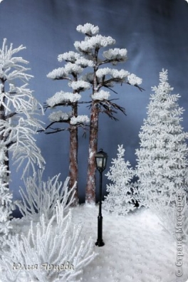 Ель, береза-техника«кораллы на проволочной основе, сосна-тоже намотка низанного колечками на проволоку бисера и скрепление каждого „кружочка“ в отдельности в пучок.