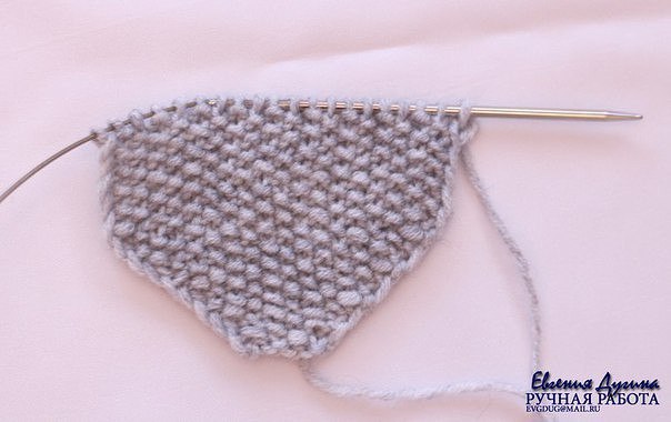 Продолжаем прибавлять петли до тех пор пока на спицах не будет 90:5=18 петель плюс наши 2 кромочные.