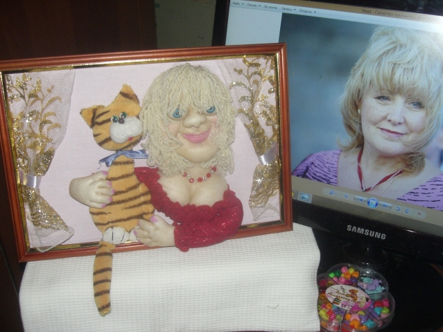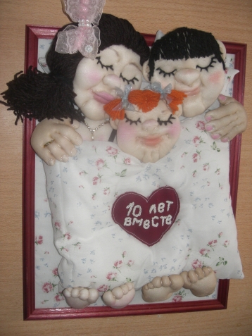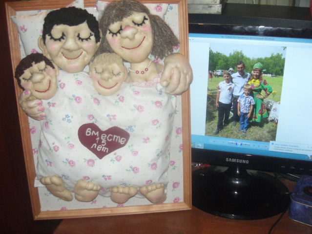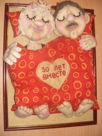 Сделала им подарок чисто символически, не добиваясь портретного сходства. Родители,конечно, были очень довольны. И гости "заценили" идею. Долго щупали мягкие лапки и носики...Пытались заглянуть под одеяло...Информация о моих способностях быстро распространилась. И вскоре мне стали поступать заказики на подобные панно к разным семейным торжествам. Теперь я уже стала просить фото юбиляра (или юбиляров) и старалась (с юморком, конечно) делать "обекты" похожими на "оригиналы". Вот посмотрите, что из этого выходит. Это не все. Это те, которые успела сфоткать...Фото любительские, не судите строго.