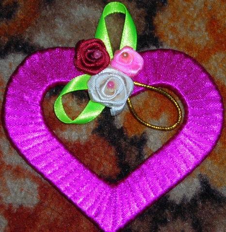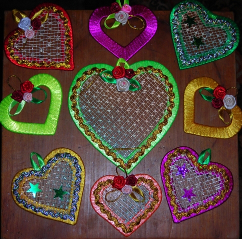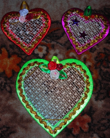 Вот такие сердечки можно сотворить из заготовочек, ленточек и прочего материала для украшения. Мой дорогой муж сотворил мне заготовки из ДВП с помощью электролобзика, отшлифовал, а я занималась "украшательством"! Использовала ленточки для основы, ткань - сеточку и разные разности. Может кому пригодится эта идейка.