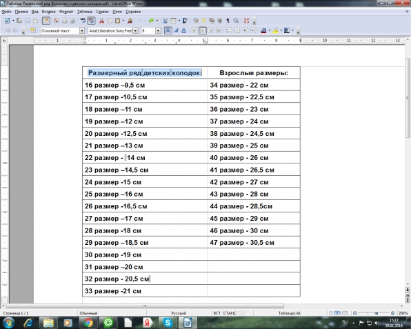 Таблица размерного ряда, взрослой и детской обуви