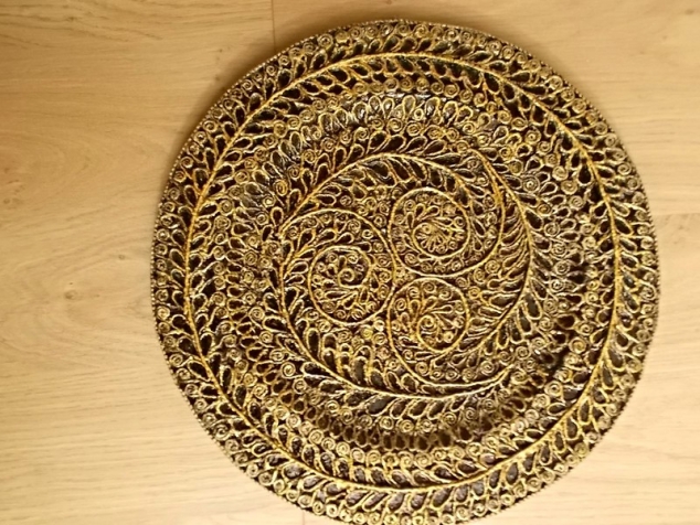 Для работы я взяла: металлическое блюдо, проволока 0,4мм, х/б нитки, клей универсальный,акриловая краска /цвета: чёрный и золотой, бесцветный лак.