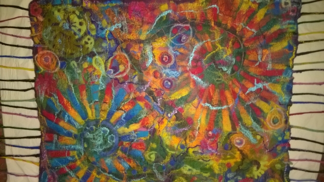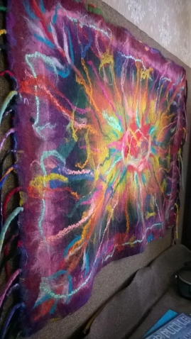 Сделала раскладку шерсти по шелку..и началась работа. Для меня первая большая по площади раскладка.Были трудности))) Честно тяжело валять ...120х140см . Но очень хотелось доставить радость - коврик в детскую комнату был заказан.