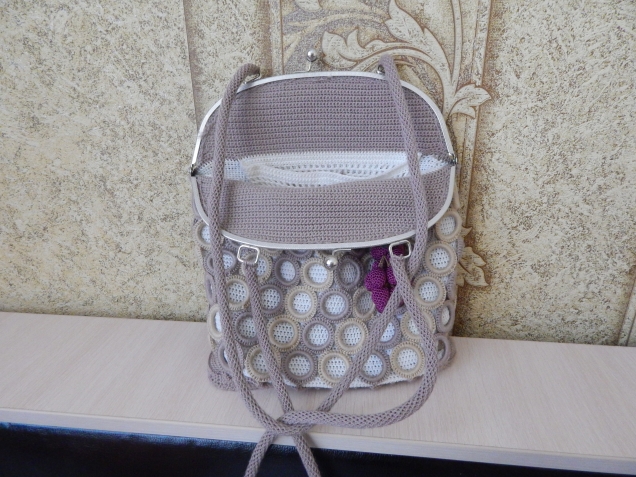 Подкладка вязаная, кармашки внутри - тоже. Донышко - вставила порезанную канцелярскую пластиковую папку.