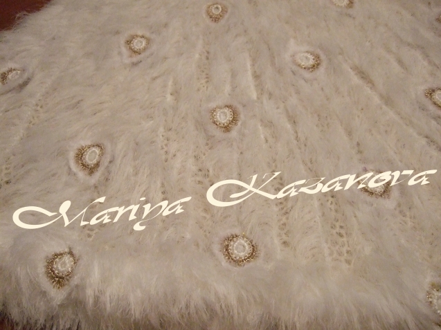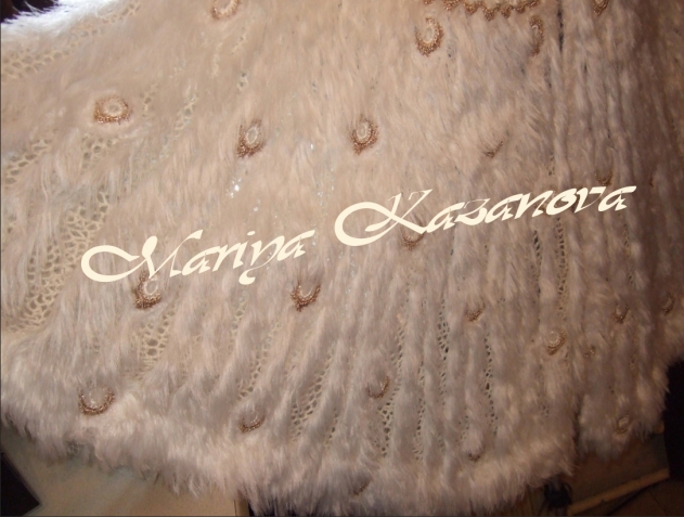 Когда я увидела белого павлина он меня просто заворожил своей красотой и я решила обязательно связать его.Но как и в какую форму всё это облечь?И я решила связать не саму птицу,а сделать накидку в виде павлиньего хвоста потрясающей красоты.Мне хотелось чтобы пёрышки были как настоящие.А что у меня получилось судить вам.Основа накидки связана нерегулярной сеткой из пряжи" Ярн арт" мохер.Пёрышки павлина связаны из белой травки "Танго" и "Лебяжьего пуха".Кокетка ажурная из белой итальянской пряжи расшита золотом и жемчугом.Очень красивые три крючка в виде бантиков со стразами. Надеюсь что Вам понравится. Фото журнала Мод.Фотомодель Ксения Митюрич.