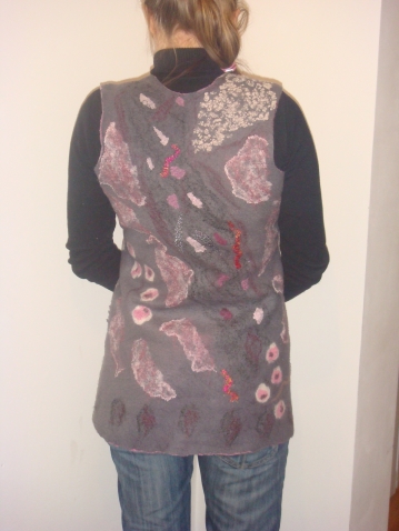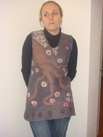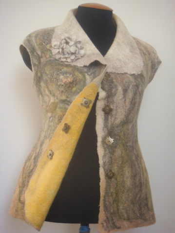 Кажется это мой первый эксперимент по созданию одежды в технике валяние, до этого было несколько шарфиков. Это сделано по МК Любы Ворониной. Настолько это все у нее хорошо описано, что сразу получилось. Этот жилет я ношу уже давно и часто, а он нисколько не меняется.